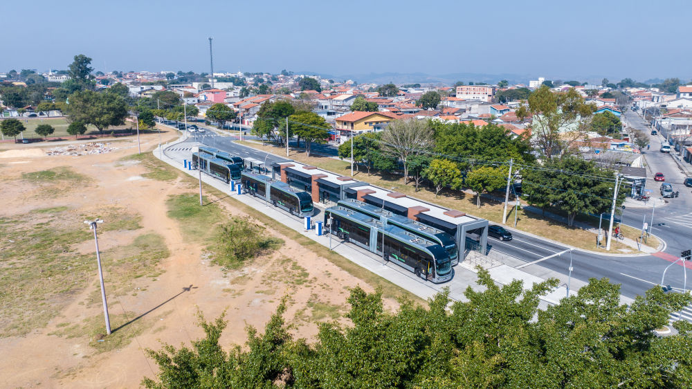 這是2023年7月12日在巴西圣保羅州圣若澤杜斯坎普斯快速公交系統(tǒng)“綠線”始發(fā)站拍攝的比亞迪純電動(dòng)大巴(無人機(jī)照片)。新華社記者王天聰攝