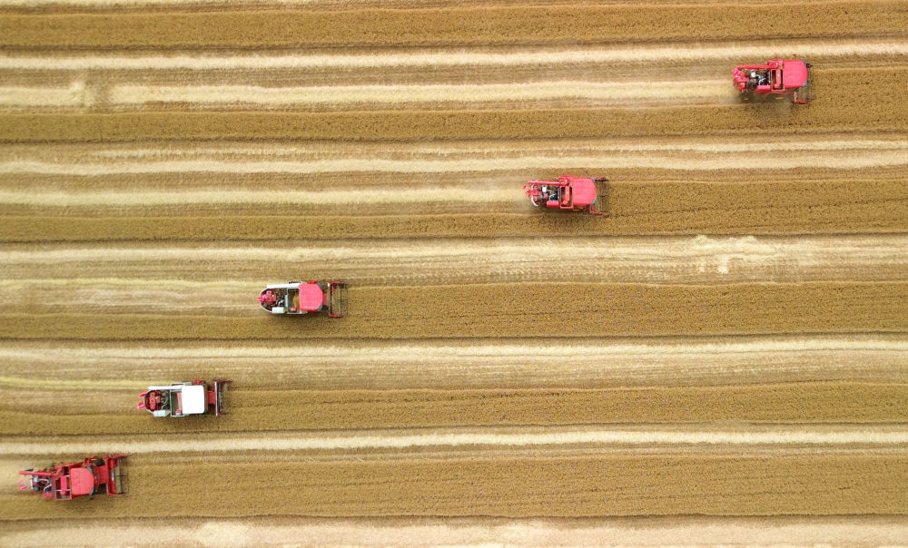 6月2日,在山東省臨沂市郯城縣廟山鎮(zhèn),參加小麥機(jī)收減損技能大比武的農(nóng)機(jī)手駕駛聯(lián)合收割機(jī)收獲小麥(無人機(jī)照片)。新華社記者 徐速繪 攝