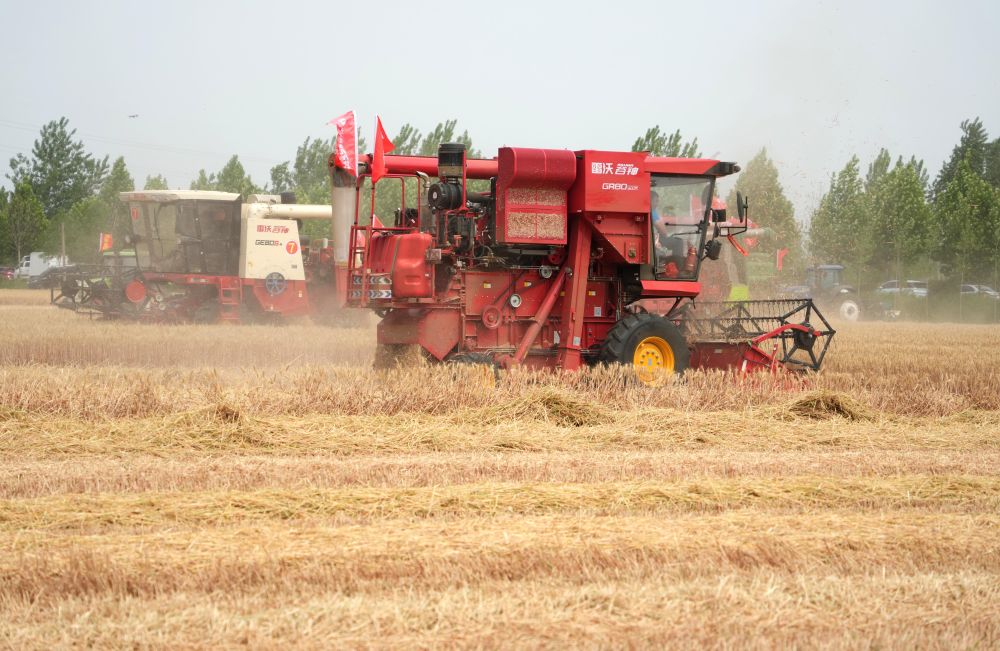 6月2日,在山東省臨沂市郯城縣廟山鎮(zhèn),參加小麥機(jī)收減損技能大比武的農(nóng)機(jī)手駕駛聯(lián)合收割機(jī)收獲小麥。 新華社記者 徐速繪 攝
