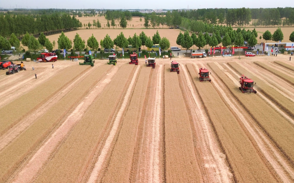 麥浪翻滾,沃野生金。麥田中,10臺(tái)收割機(jī)依次排開;一聲令下,農(nóng)機(jī)手駕駛收割機(jī)勻速前行,風(fēng)中搖曳的麥穗被吸入“腹中”,田間只剩下短短的麥茬。