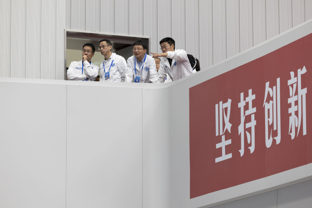 6月4日,在北京航天飛行控制中心,嫦娥六號(hào)任務(wù)總設(shè)計(jì)師胡浩(左)、長征五號(hào)運(yùn)載火箭總設(shè)計(jì)師李東和嫦娥六號(hào)任務(wù)副總設(shè)計(jì)師王瓊(前)交流嫦娥六號(hào)任務(wù)進(jìn)展情況。