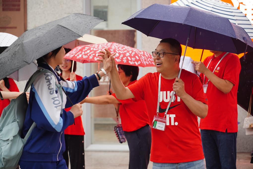 雖然天空下著雨,北京一零一中學(xué)的送考老師們還是早早在校門口排成一列,與陸續(xù)趕來的考生一一擊掌鼓勁。在校門口刷臉驗(yàn)證身份后,考生通過提前搭設(shè)的紅色晴雨走廊,步入候考區(qū)及考場(chǎng)。