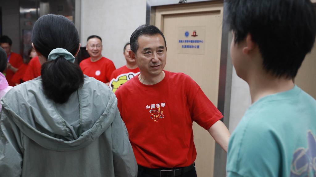 6月7日,北京一零一中學(xué)的送考老師們?cè)谛iT口為考生加油鼓勁。(北京一零一中學(xué)供圖)