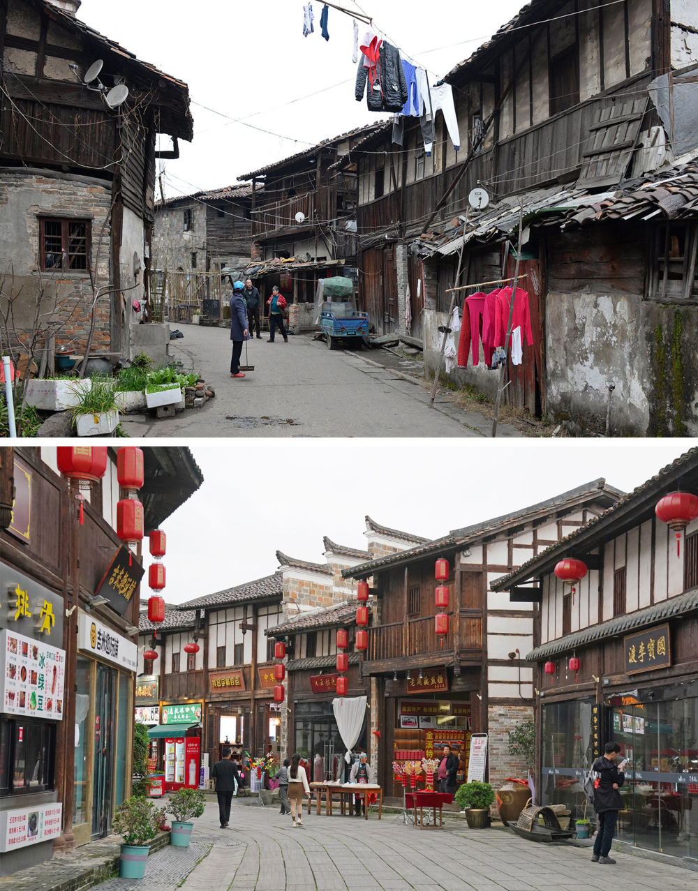 拼版照片:上圖為撫州文昌里歷史文化街區(qū)三角巷修繕前的樣貌(資料照片);下圖為同一地點(diǎn)修繕后的街景(2024年4月9日新華社記者萬(wàn)象攝)。新華社發(fā)