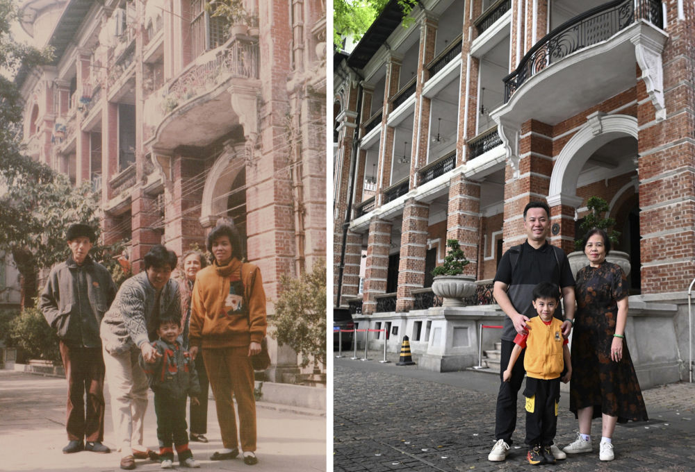 拼版照片:左圖為廣州市民杜煜杰(前中)與母親(右一)等于1989年在廣州沙面合影(受訪者提供);右圖為2024年4月13日杜煜杰(后左)與母親、兒子在廣州沙面同一棟建筑前合影(新華社記者鄧華攝)。新華社發(fā)