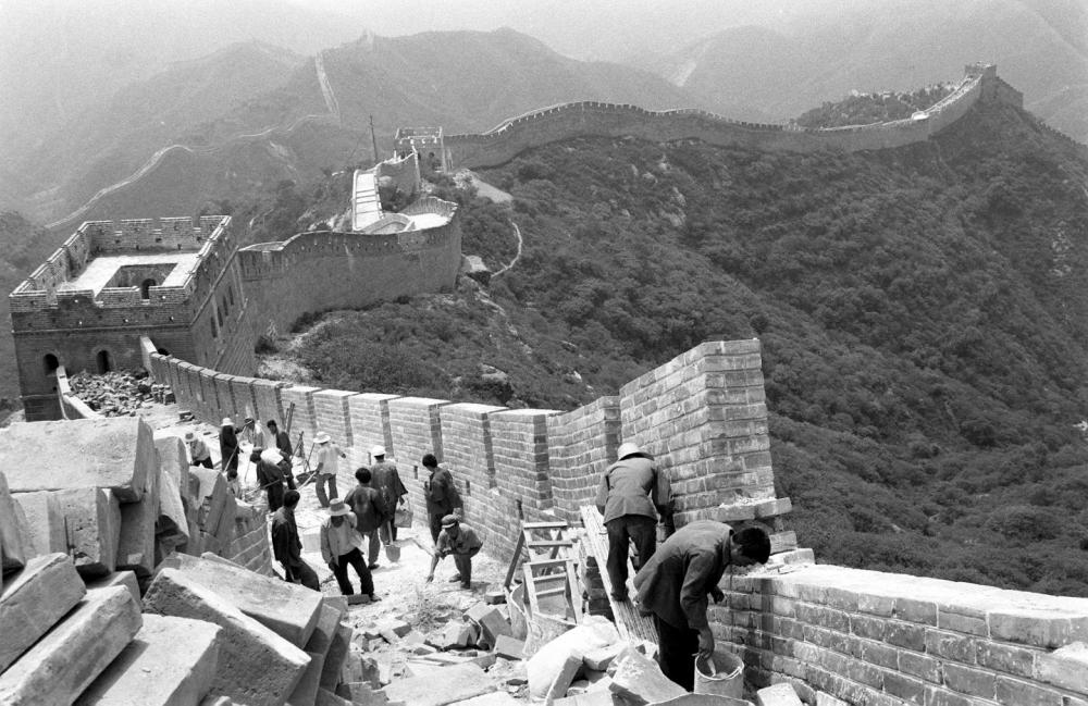 工人正在修復(fù)北京八達(dá)嶺長城的一段城墻。這是用由北京晚報(bào)、八達(dá)嶺特區(qū)辦事處等單位聯(lián)合發(fā)起“愛我中華 修我長城”社會(huì)贊助活動(dòng)所獲款項(xiàng)進(jìn)行修復(fù)的第一期工程 (資料照片,1984年8月11日發(fā))。新華社記者 袁汝遜 攝