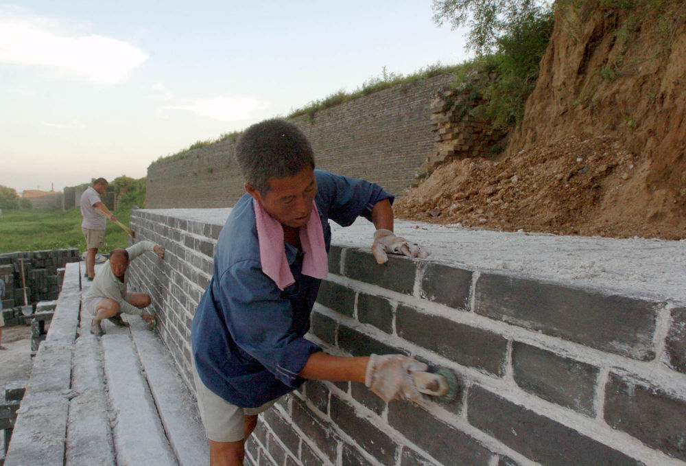 古建工人在修復(fù)山海關(guān)古城城墻(2005年8月29日攝)。新華社發(fā)