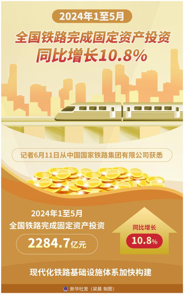 新華社北京6月11日電(記者樊曦、韓佳諾)記者11日從中國國家鐵路集團有限公司獲悉,今年1至5月,全國鐵路完成固定資產(chǎn)投資2284.7億元,同比增長10.8%,現(xiàn)代化鐵路基礎設施體系加快構建。