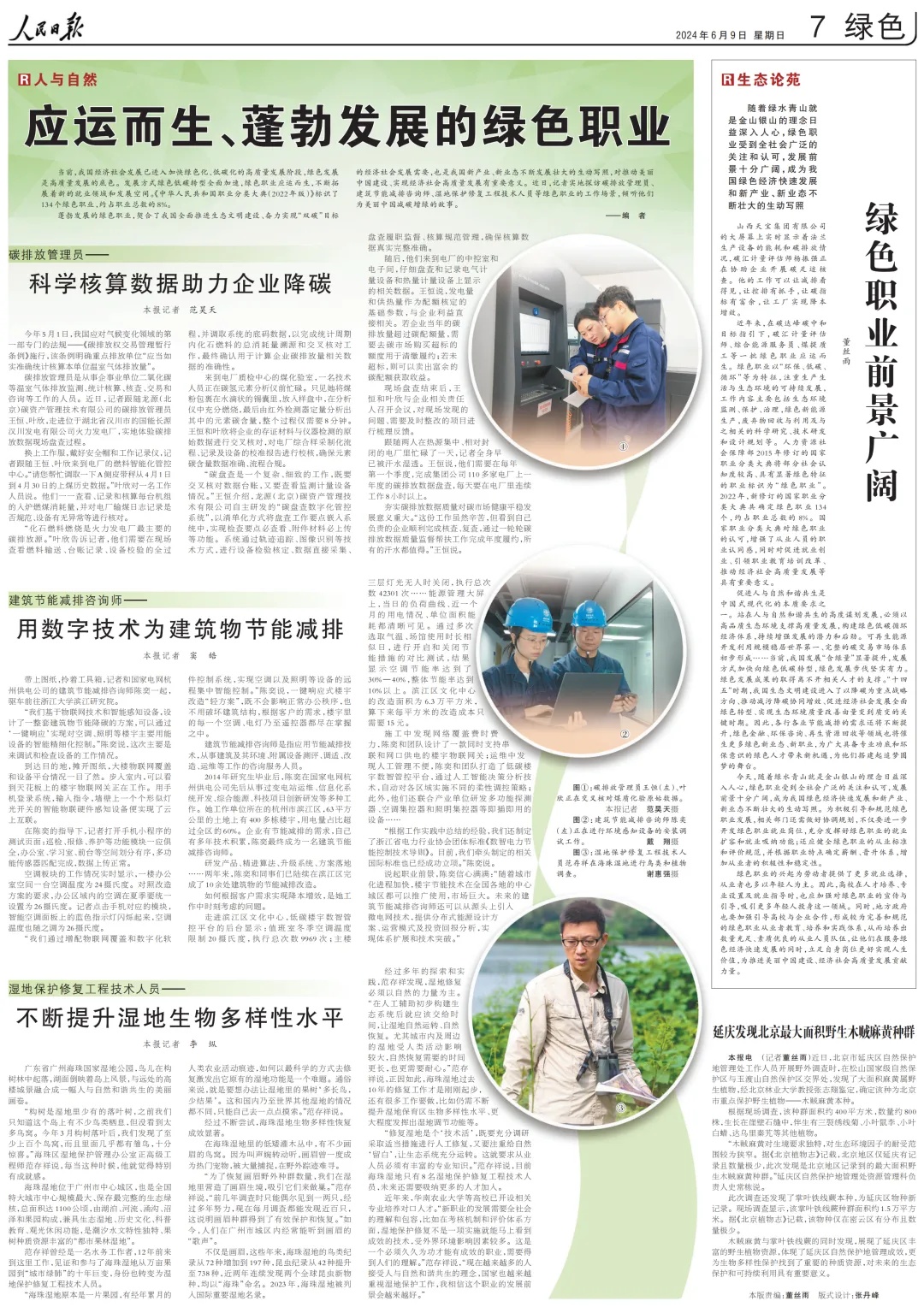 蓬勃發(fā)展的綠色職業(yè),契合了我國全面推進(jìn)生態(tài)文明建設(shè)、奮力實現(xiàn)“雙碳”目標(biāo)的經(jīng)濟(jì)社會發(fā)展需要,也是我國新產(chǎn)業(yè)、新業(yè)態(tài)不斷發(fā)展壯大的生動寫照,對推動美麗中國建設(shè)、實現(xiàn)經(jīng)濟(jì)社會高質(zhì)量發(fā)展有重要意義。近日,人民日報記者實地探訪碳排放管理員、建筑節(jié)能減排咨詢師、濕地保護(hù)修復(fù)工程技術(shù)人員等綠色職業(yè)的工作場景,傾聽他們?yōu)槊利愔袊鴾p碳增綠的故事。