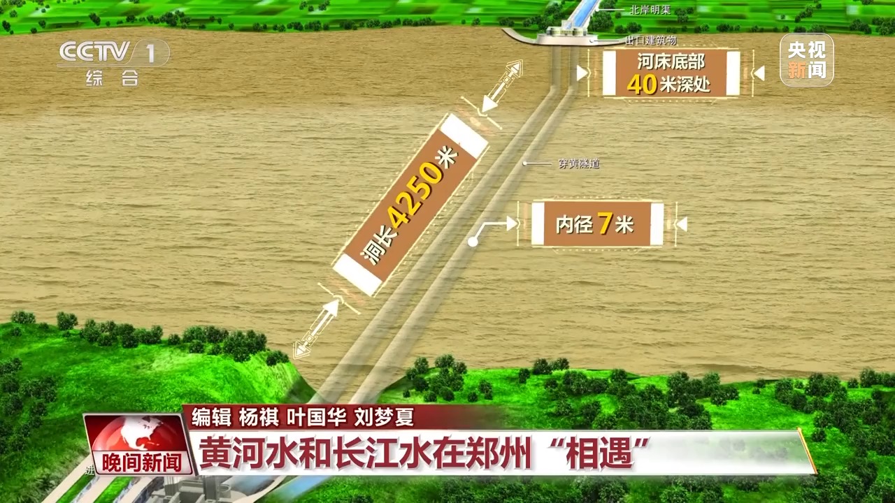 南水北調(diào)工程建設(shè)者在鄭州花園口西黃河河床底部40米深處開鑿兩條隧道,穿黃隧道為雙線有壓輸水隧道,單個(gè)洞長4250米,內(nèi)徑7米,這樣的內(nèi)徑可以滿足洞內(nèi)跑汽車。有了“穿黃工程”,北上的長江水通過兩條穿黃隧道與黃河立體交叉相遇。平時(shí),黃河水在上面流,南水北調(diào)的長江水在河底隧道中流過,兩者上下而過,猶如一條巨龍?jiān)邳S河之下隱去了身影。