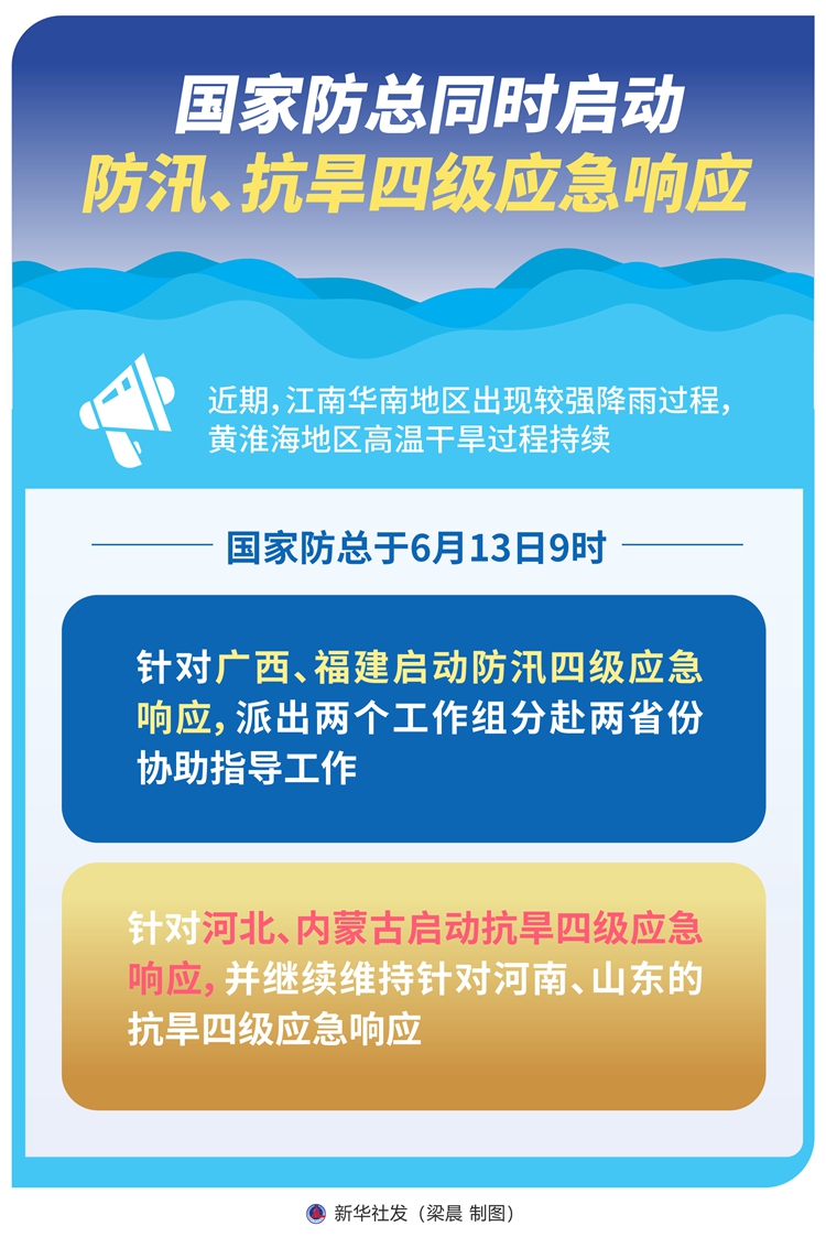 近期,江南華南地區(qū)出現(xiàn)較強(qiáng)降雨過(guò)程,黃淮海地區(qū)高溫干旱過(guò)程持續(xù)。國(guó)家防總于6月13日9時(shí)針對(duì)廣西、福建啟動(dòng)防汛四級(jí)應(yīng)急響應(yīng),派出兩個(gè)工作組分赴兩省份協(xié)助指導(dǎo)工作;針對(duì)河北、內(nèi)蒙古啟動(dòng)抗旱四級(jí)應(yīng)急響應(yīng),并繼續(xù)維持針對(duì)河南、山東的抗旱四級(jí)應(yīng)急響應(yīng)。