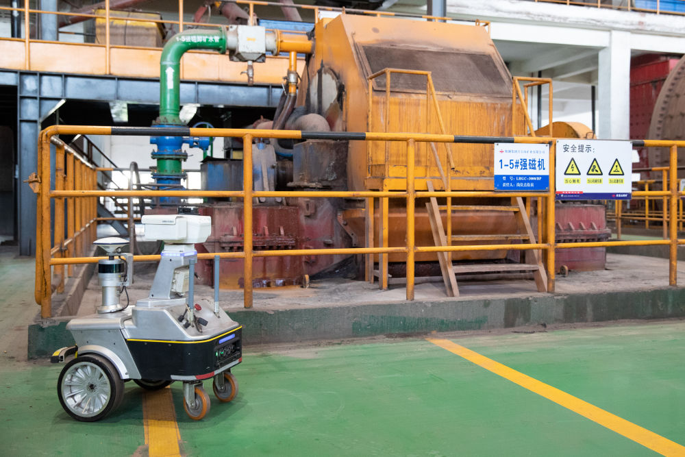生產現(xiàn)場無人化,依靠什么來實現(xiàn)?步入磨磁車間,巨大的轟鳴聲在這個長約100米、寬約50米、高約30米的廠房內回響。登上二樓作業(yè)平臺,兩臺直徑6.2米的大型球磨機上的轉輪正在飛速旋轉。不遠處,磨磁巡檢機器人閃爍著燈光,正在采集設備溫度、振動等狀態(tài)數(shù)據(jù)。