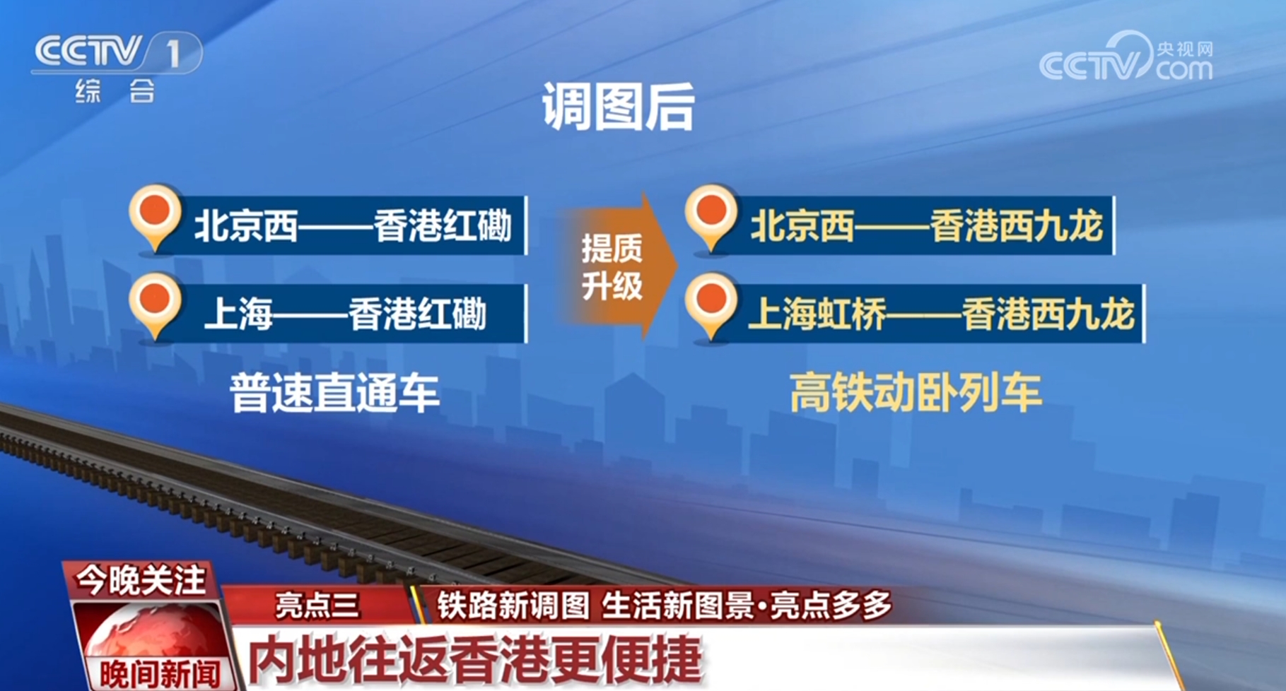 調圖后,北京西、上海與香港紅磡站間開行的普速直通車,提質升級為北京西、上海虹橋與香港西九龍站間的高鐵動臥列車。北京至香港的全程旅行時間由原來的24小時31分壓縮至12小時34分,上海到香港從19小時34分壓縮至11小時14分。京港、滬港間實現夕發(fā)朝至,動臥的出行方式更可省去一晚酒店費用。