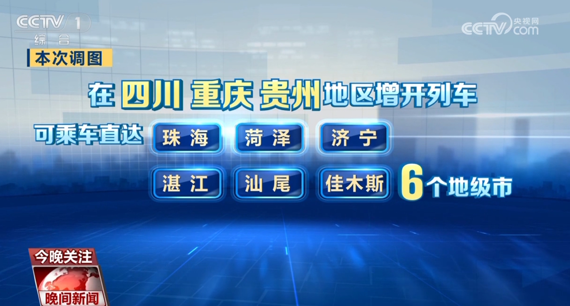 本次調圖,在鄭州、武漢、長沙等城市間增開復興號動車組標桿列車28列,進一步壓縮了中部地區(qū)省會城市間的時空距離;在四川重慶貴州地區(qū)增開列車,旅客從川渝貴三地可乘車直達珠海、菏澤、濟寧、湛江、汕尾、佳木斯6個地級市。此外,首開太原至深圳的動車組列車,旅行時間為8小時17分,較普速旅客列車壓縮了27小時57分。