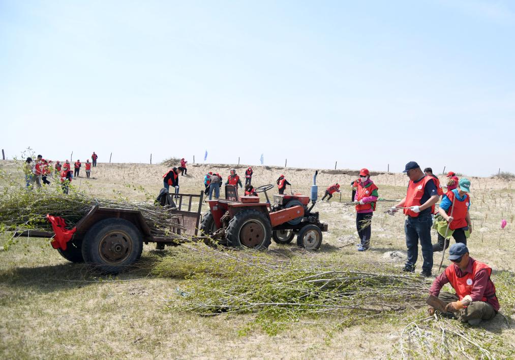 2024年5月6日,在地處渾善達(dá)克沙地的內(nèi)蒙古錫林郭勒盟正藍(lán)旗寶紹岱蘇木扎魯特嘎查,志愿者們開展植綠活動。新華社發(fā)(巴依斯古楞 攝)