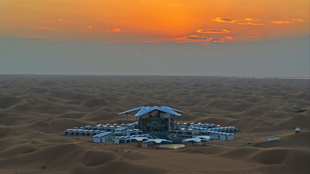 這是位于寧夏中衛(wèi)市沙坡頭景區(qū)的星星酒店(2023年9月6日攝,無人機(jī)照片)。新華社記者 王鵬 攝