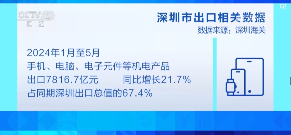2024年前5個月,深圳市出口總額達(dá)1.16萬億元,同比增長37.2%。其中,手機、電腦、電子元件等機電產(chǎn)品出口7816.7億元,同比增長21.7%,占同期深圳出口總值的67.4%。