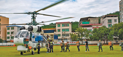 6月17日,廣東省梅州市平遠縣體育場,直升機在運送救援物資。