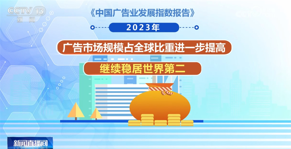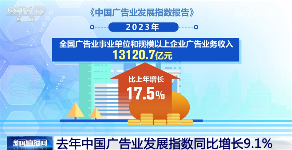 《中國廣告業(yè)發(fā)展指數(shù)報(bào)告》顯示,我國廣告業(yè)規(guī)模快速提升,產(chǎn)業(yè)活力不斷釋放。2023年,全國廣告業(yè)事業(yè)單位和規(guī)模以上企業(yè)廣告業(yè)務(wù)收入13120.7億元,比上年增長17.5%,廣告市場規(guī)模占全球比重進(jìn)一步提高,繼續(xù)穩(wěn)居世界第二。