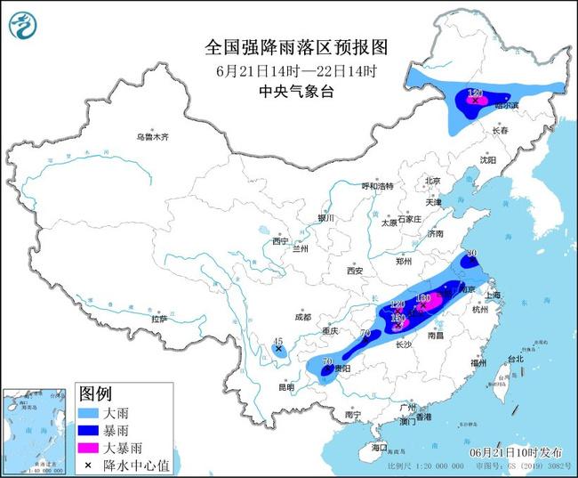 預計,6月21日14時至22日14時,貴州中南部、湖南北部、湖北東部和南部、河南東南部、江西西北部、安徽、江蘇以及內(nèi)蒙古東部、黑龍江南部、吉林西北部等地部分地區(qū)有大到暴雨,其中,安徽中部、湖北東部和南部、湖南東北部、內(nèi)蒙古東部、黑龍江西南部、吉林西北部等地局地有大暴雨(100~180毫米)。上述部分地區(qū)伴有短時強降水(最大小時降雨量30~50毫米,局地可超過80毫米),局地有雷暴大風等強對流天氣。