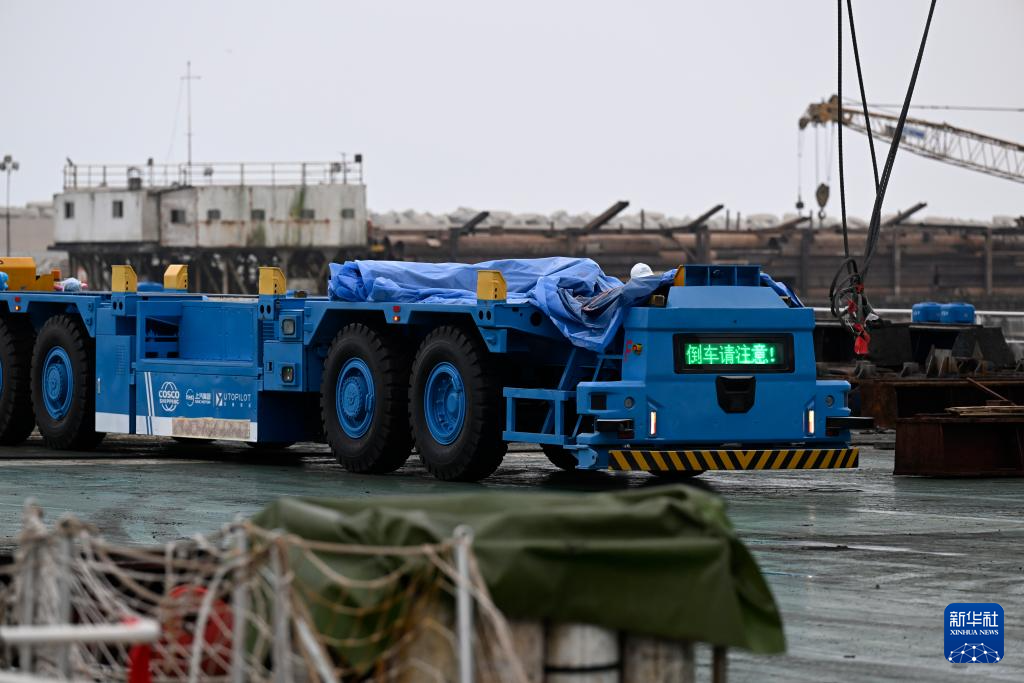 這是6月21日在秘魯錢凱港碼頭操作區(qū)拍攝的具備自動駕駛技術的電動集裝箱卡車。 新華社記者 李木子 攝