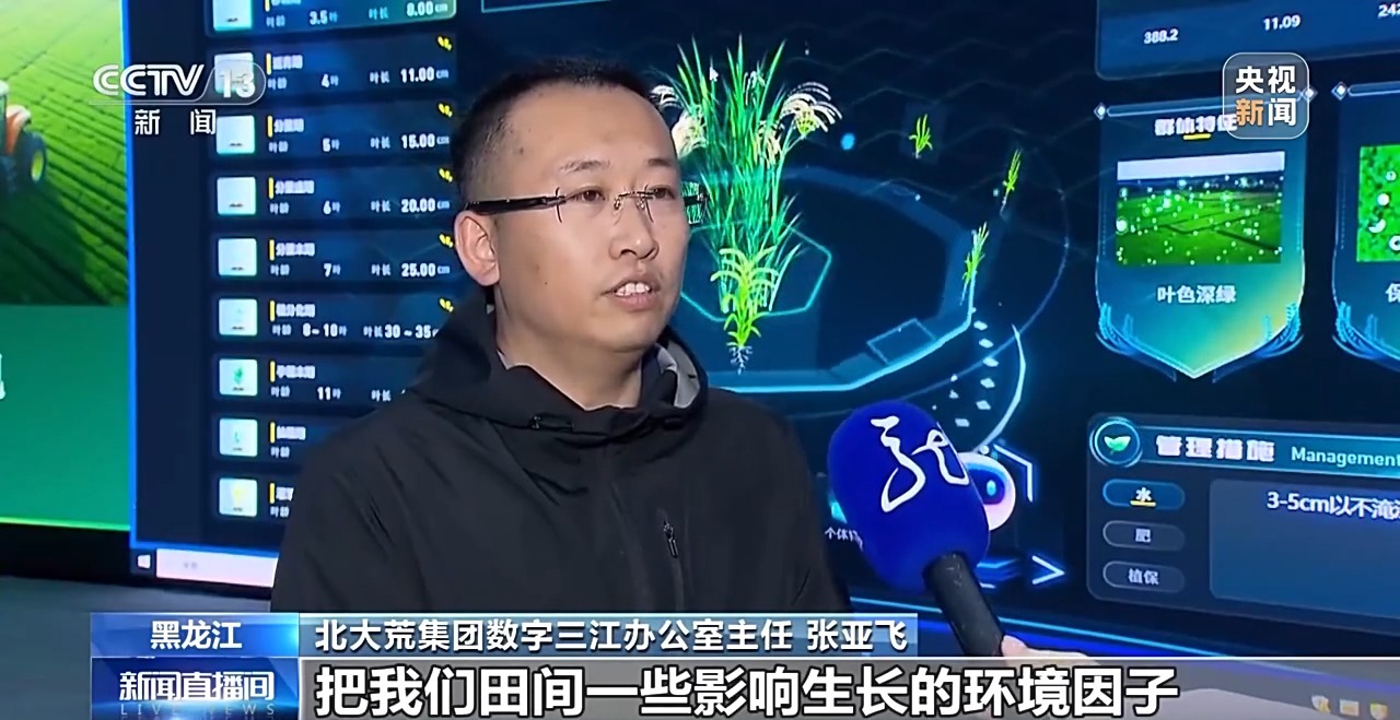 北大荒集團(tuán)數(shù)字三江辦公室主任 張亞飛:通過(guò)無(wú)人機(jī)群把我們田間的一些影響生長(zhǎng)的環(huán)境因子采集回來(lái),然后輸入到我們的大模型之內(nèi),采取的手段是空、天、地、人機(jī)一體化的感知手段,形成當(dāng)時(shí)、當(dāng)季需要進(jìn)行的農(nóng)事活動(dòng)的決策指令,通過(guò)這個(gè)數(shù)字生產(chǎn)模型來(lái)指導(dǎo)我們的種植戶更加科學(xué)地進(jìn)行種植,提高水稻單產(chǎn)。