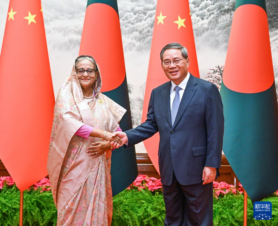 國務(wù)院總理李強7月10日上午在北京人民大會堂同來華進行正式訪問的孟加拉國總理哈西娜舉行會談。