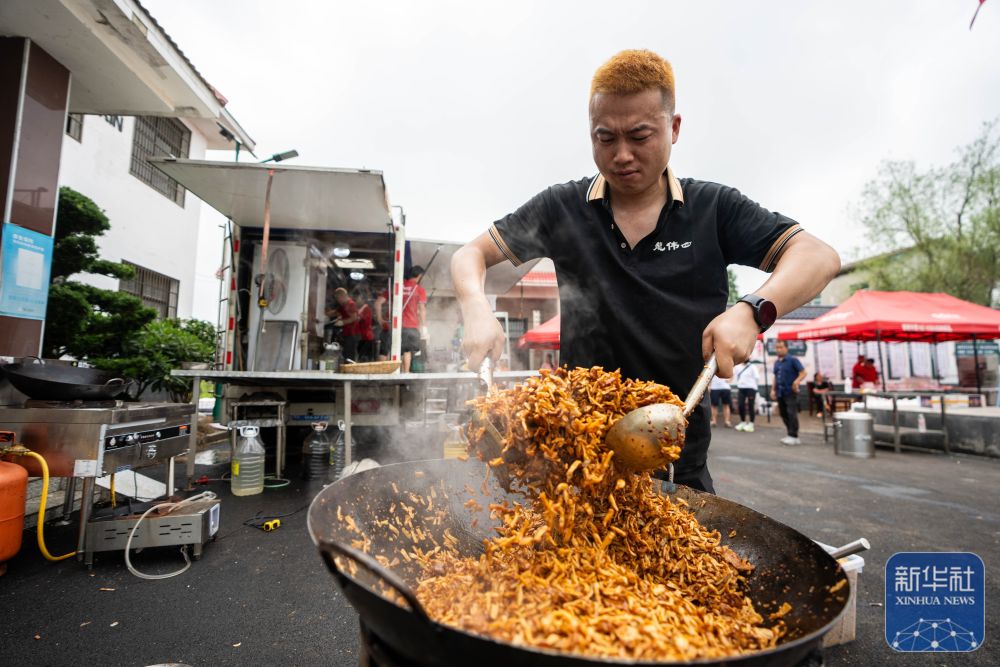 7月10日,在岳陽市良心堡鎮(zhèn)望君洲村,志愿者在炒制菜肴。新華社記者 陳思汗 攝
