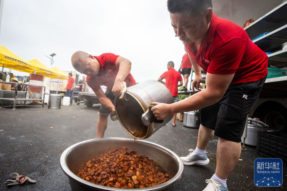 7月10日,在岳陽市良心堡鎮(zhèn)望君洲村,志愿者在炒菜。新華社記者 陳澤國 攝