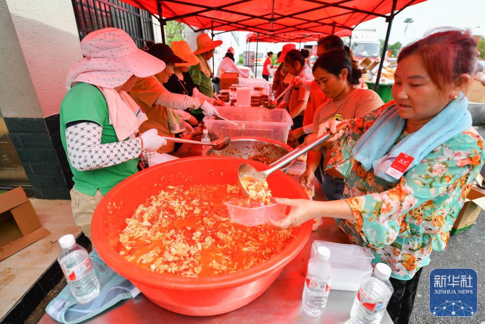 7月10日,在岳陽市良心堡鎮(zhèn)望君洲村,志愿者在打包盒飯。新華社記者 陳振海 攝