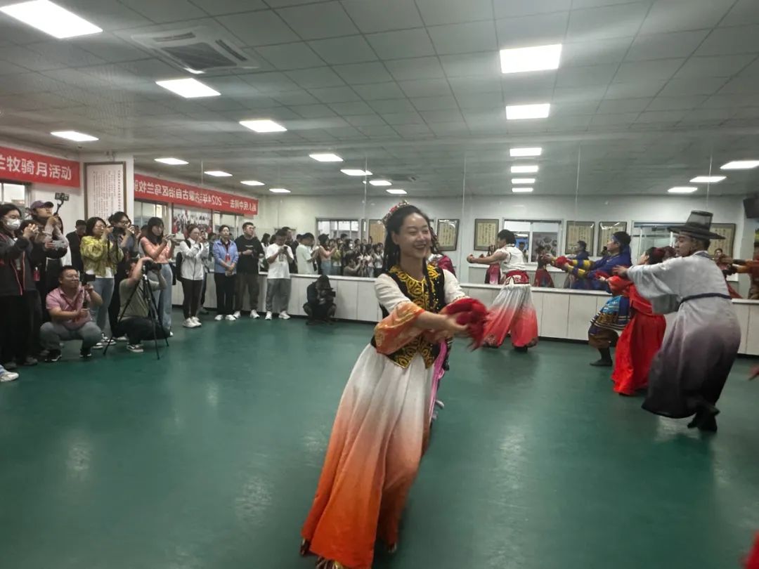 社區(qū)居民在烏蘭牧騎隊員指導(dǎo)下載歌載舞。
