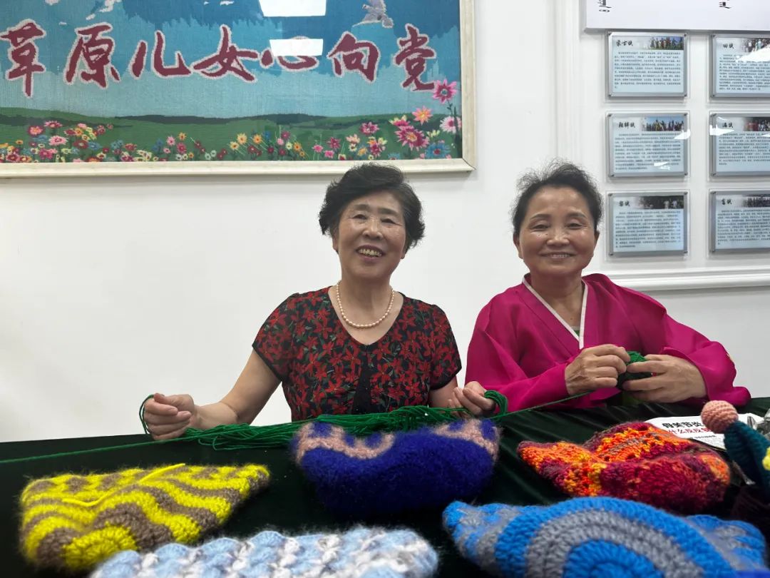 民族工藝傳承區(qū)里,志愿者高娃帶領(lǐng)圍坐桌前的“同學(xué)們”編織各類毛線織品,絲線繡出來的花鳥圖案引起記者們的注意。朝鮮族居民李貞子和漢族居民劉海燕是“老搭檔”,屬于“零基礎(chǔ)”學(xué)員的她們連續(xù)多年堅持每周上課,即便沒有課程也會來活動中心相互切磋?,F(xiàn)在,課堂上教過的各式民族工藝織品,二人都能信手拈來。