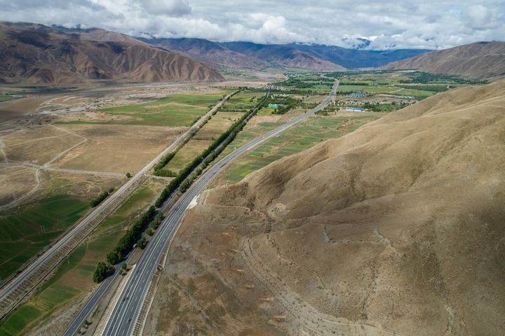 俯瞰西藏拉薩市至日喀則市區(qū)間的交通網(wǎng)絡,從左至右依次為農(nóng)村公路、鐵路、國道和高等級公路(2024年6月27日攝,無人機照片)。