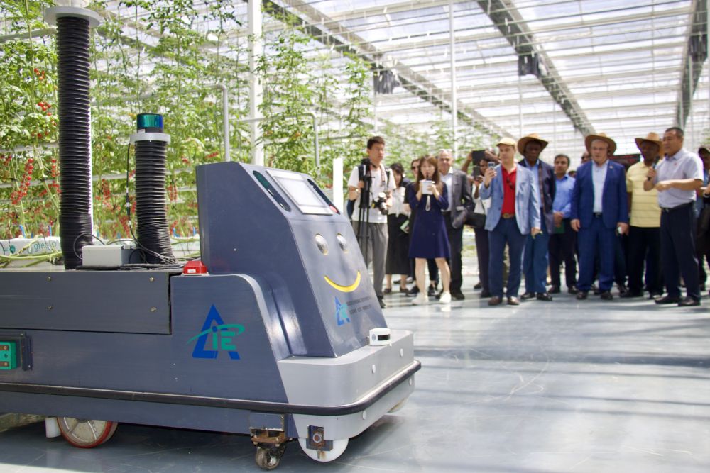 鄂爾多斯市達(dá)拉特旗德農(nóng)現(xiàn)代高效設(shè)施農(nóng)業(yè)產(chǎn)業(yè)園13000平米的大棚內(nèi),全自動(dòng)機(jī)器人在無(wú)土栽培的西紅柿藤蔓間往來(lái)穿梭,高效完成巡檢、采摘、施肥等各項(xiàng)工作。使節(jié)們邊看邊贊嘆不已。