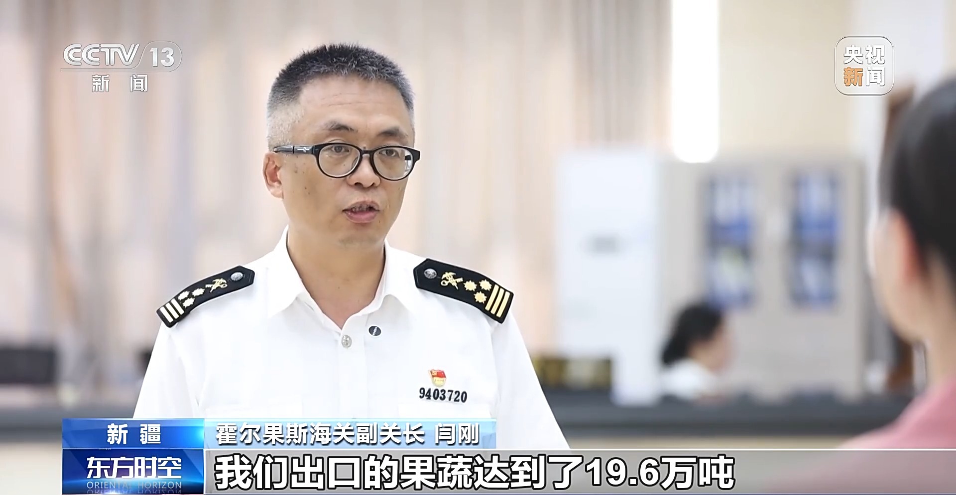 霍爾果斯海關(guān)副關(guān)長(zhǎng) 閆剛:果蔬出口一直是我們口岸的一大特色和亮點(diǎn),2023年全年我們出口的果蔬達(dá)到了19.6萬(wàn)噸,今年1—6月份,我們出口的果蔬就達(dá)到了20萬(wàn)噸,就是說(shuō)我們今年上半年已經(jīng)完成了去年全年的量,這說(shuō)明“提前申報(bào)+口岸直通”的通關(guān)模式,對(duì)果蔬出口,對(duì)企業(yè)減少成本有巨大的推進(jìn)作用。