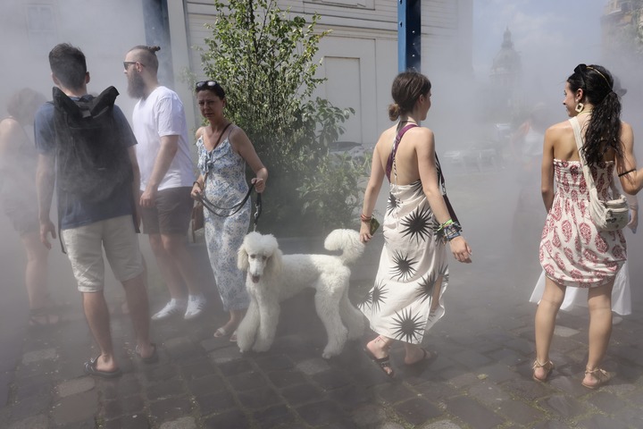 7月11日,在匈牙利布達佩斯,人們在噴霧裝置中感受清涼一刻。新華社發(fā)(弗爾季·奧蒂洛攝)