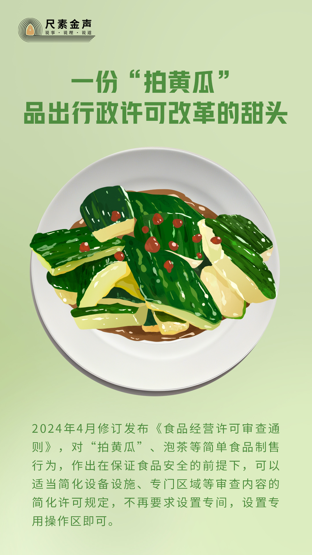 結(jié)合餐飲業(yè)實(shí)際,考慮中小經(jīng)營主體和消費(fèi)者的訴求,科學(xué)評估食品安全風(fēng)險,去年6月,市場監(jiān)管總局修訂發(fā)布《食品經(jīng)營許可和備案管理辦法》,今年4月修訂發(fā)布《食品經(jīng)營許可審查通則》,對“拍黃瓜”、泡茶等簡單食品制售行為,作出在保證食品安全的前提下,可以適當(dāng)簡化設(shè)備設(shè)施、專門區(qū)域等審查內(nèi)容的簡化許可規(guī)定,不再要求設(shè)置專間,設(shè)置專用操作區(qū)即可。各地市場監(jiān)管部門立足當(dāng)?shù)貙?shí)際優(yōu)化“拍黃瓜”經(jīng)營許可條件,相繼出臺相關(guān)食品經(jīng)營許可和備案管理實(shí)施細(xì)則。比如,修訂的《上海市食品經(jīng)營許可和備案管理實(shí)施辦法》已于5月10日正式實(shí)施,明確加工制作植物性冷食類食品(不含非發(fā)酵豆制品),可申請簡單制售經(jīng)營項目,在保證食品安全的前提下,可僅設(shè)置專區(qū)。