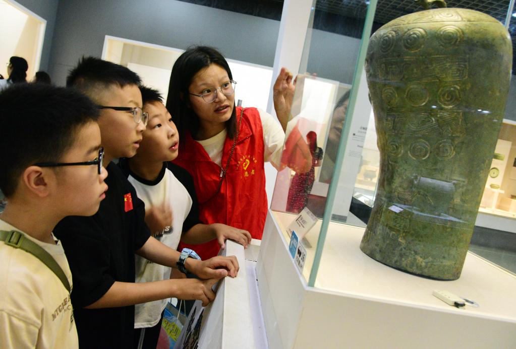 7月14日,在江蘇省鎮(zhèn)江博物館,江蘇大學志愿者為小朋友介紹文物。新華社發(fā)(石玉成 攝)