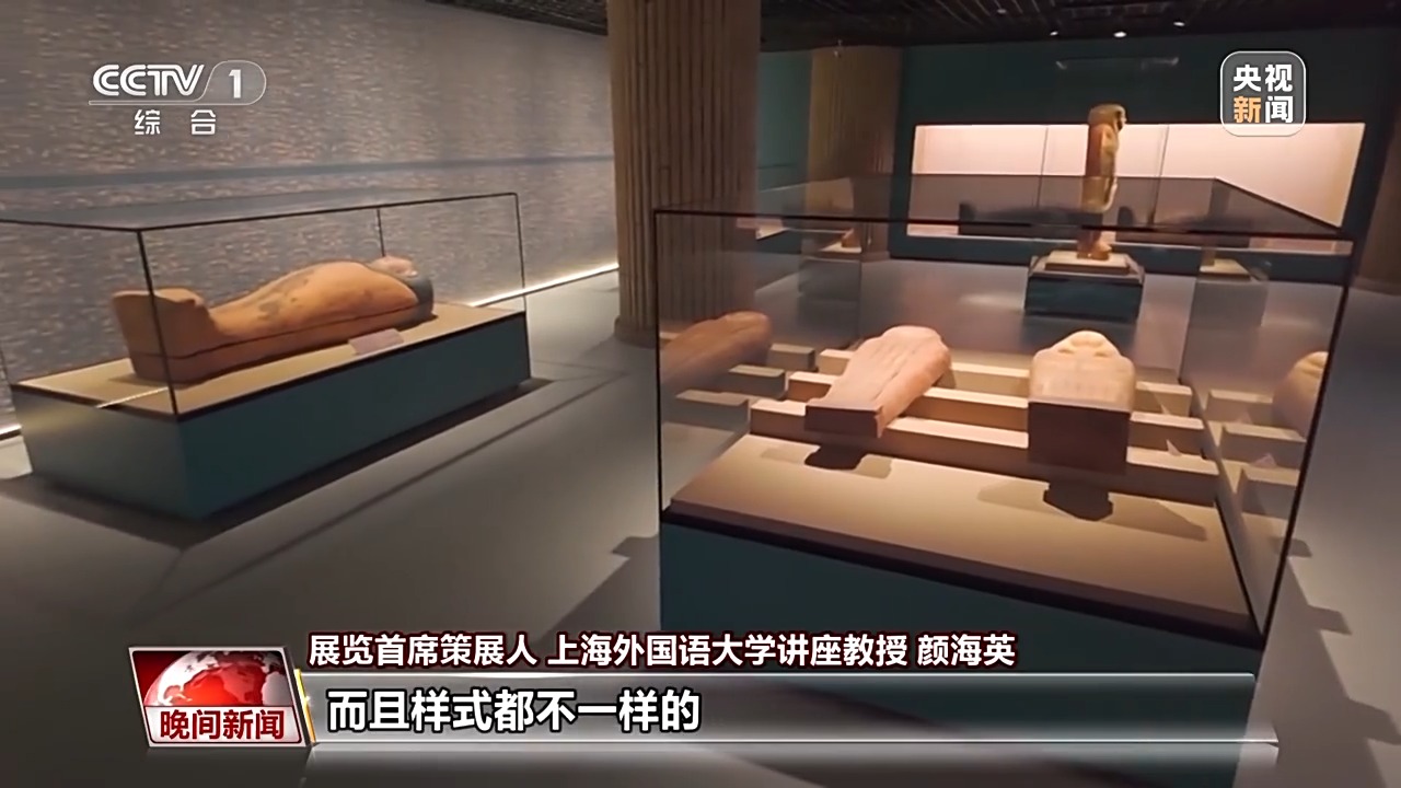 展覽首席策展人、上海外國語大學(xué)講座教授 顏海英:選了10個最精美的,而且樣式都不一樣的彩繪人形棺,其中最大的一個特點就是它的臉涂成不同的顏色,現(xiàn)在展廳里面立著一個綠臉的棺,然后還有紅臉的、黑臉的,那它具體是什么不同的象征含義,現(xiàn)在我們還沒有解讀,這是未來將要研究的問題。