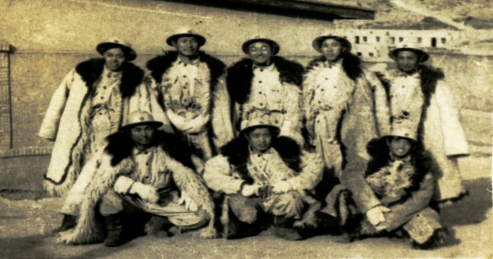 1951年在玉門油礦高地住所穿老羊皮工作服合影(前排右一為方華燦)。新華社發(fā)