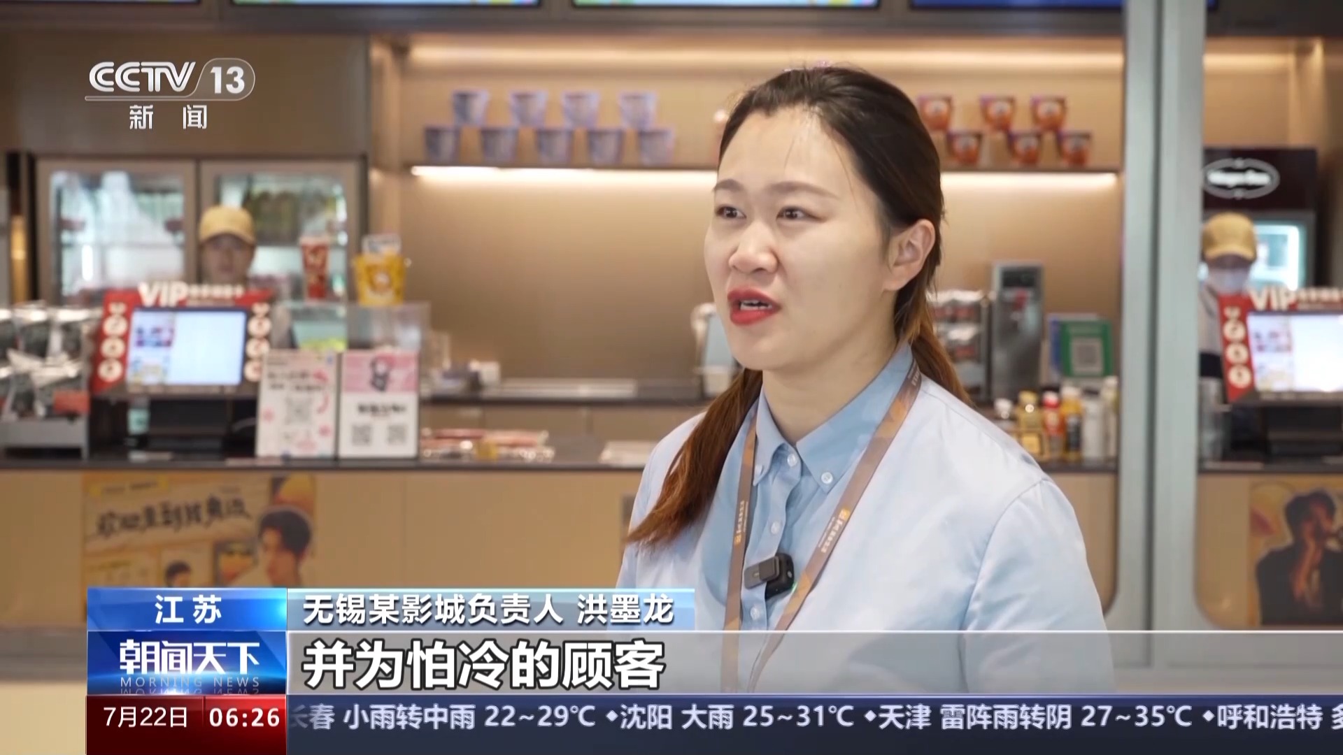無錫某影城負(fù)責(zé)人 洪墨龍:首先我們保證影廳的溫度適宜,并為怕冷的顧客提供免費(fèi)干凈的毛毯。我們還會(huì)通過現(xiàn)場的陳列布置,打造主題觀影氛圍,讓觀眾在觀影過程中有更多的參與感和互動(dòng)體驗(yàn)。