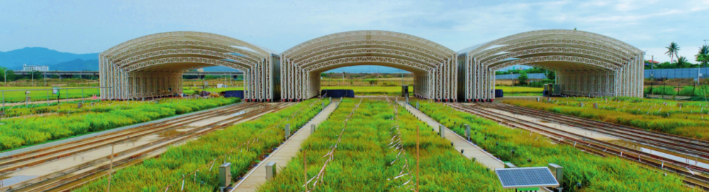 在位于三亞的國家耐鹽堿水稻技術(shù)創(chuàng)新中心崖州灣總部科研試驗基地,建設(shè)了高標(biāo)準(zhǔn)試驗田、鹽(堿)性精準(zhǔn)鑒定鹽池、自動防雨鋼棚、水土鹽堿度智能化監(jiān)測系統(tǒng)等配套設(shè)施(2024年5月17日攝)。黎多江攝/本刊