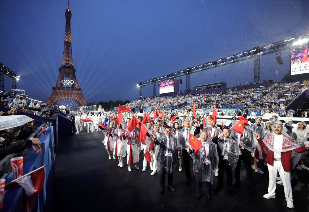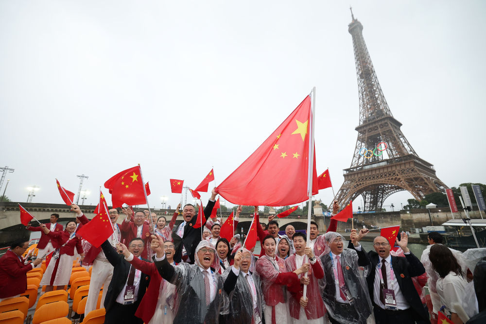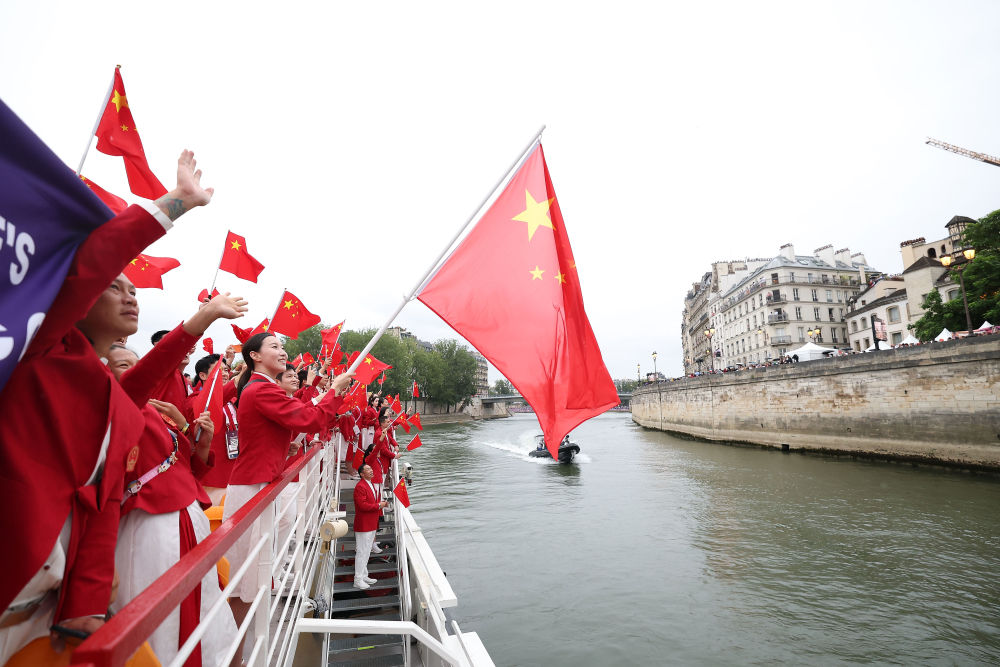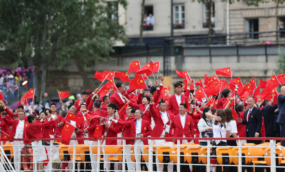 當(dāng)?shù)貢r間7月26日,第33屆夏季奧林匹克運動會開幕式在法國巴黎舉行。乒乓球運動員馬龍、花樣游泳運動員馮雨高擎五星紅旗,中國體育代表團運動員乘船在塞納河巡游。