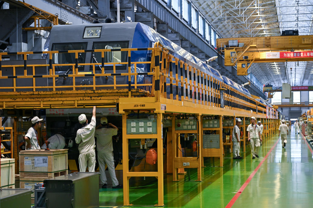 7月26日,中車(chē)株機(jī)公司工作人員在總成車(chē)間組裝大功率電力機(jī)車(chē)。新華社記者 李鑫 攝