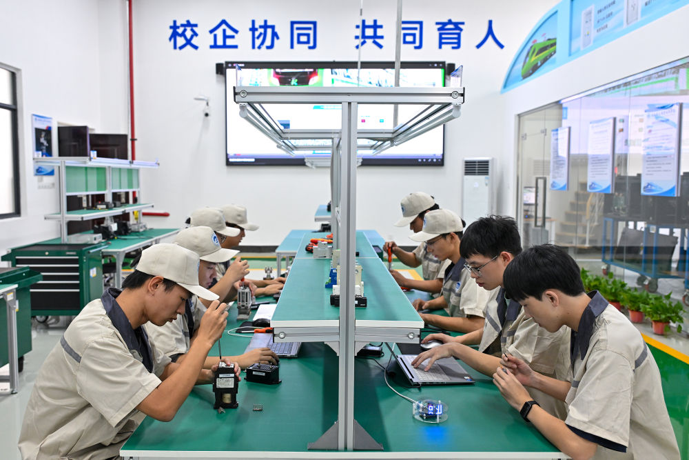 7月26日,湖南鐵道職業(yè)技術(shù)學(xué)院的學(xué)生在車(chē)載電源系統(tǒng)運(yùn)維實(shí)訓(xùn)室進(jìn)行核心零部件的拆裝與檢測(cè)訓(xùn)練。該實(shí)訓(xùn)室可開(kāi)展軌道車(chē)輛逆變裝置運(yùn)行、維護(hù)、試驗(yàn)、檢修等實(shí)習(xí)實(shí)訓(xùn),電源變換技術(shù)、電力電子技術(shù)等課程實(shí)習(xí)實(shí)訓(xùn)。新華社記者 李鑫 攝