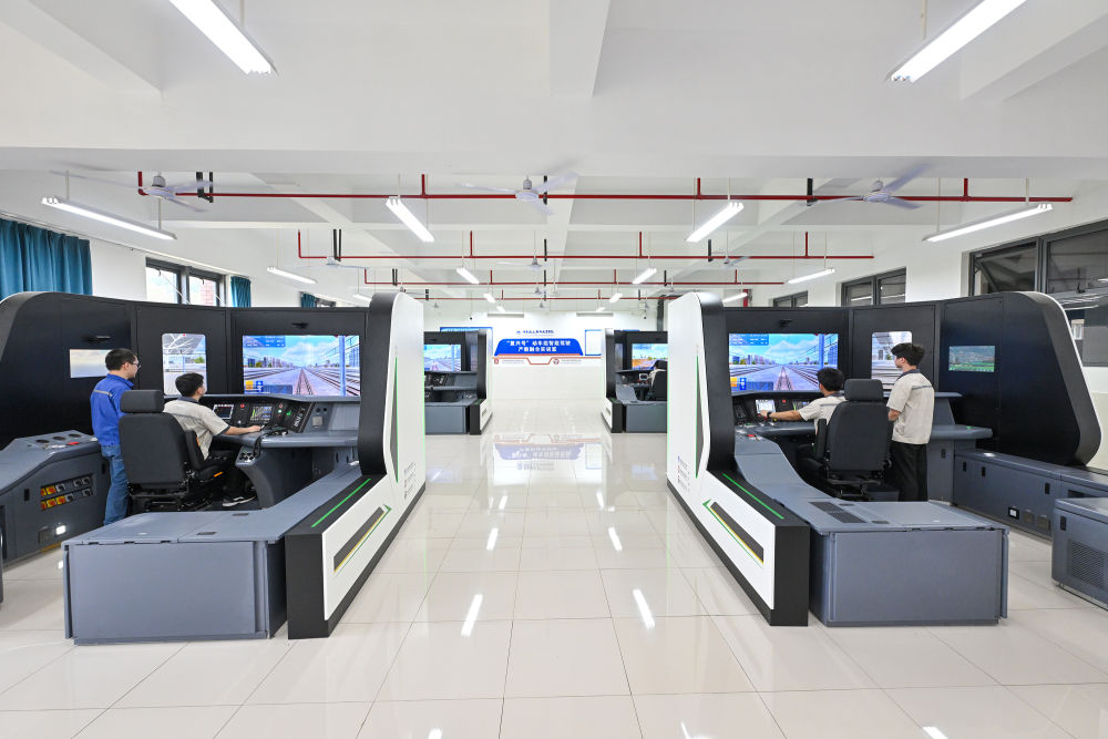 7月26日,湖南鐵道職業(yè)技術(shù)學(xué)院的學(xué)生在產(chǎn)教融合“復(fù)興號(hào)”動(dòng)車(chē)組智能駕駛實(shí)訓(xùn)室內(nèi)學(xué)習(xí)動(dòng)車(chē)駕駛。 新華社記者 李鑫 攝