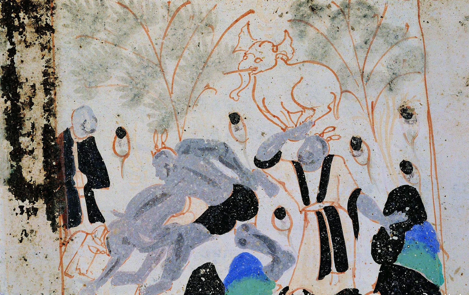 馬術(shù):敦煌壁畫中的馬術(shù)畫,以呈現(xiàn)賽馬和馬上技巧為主。莫高窟61窟中還有一幅五代時(shí)期多人于馬上進(jìn)行技巧競(jìng)賽的壁畫,在開闊的草地上,一人騎在四蹄幾乎拉直飛奔的馬上,突然離鞍從一側(cè)俯身,用手撿拾放置在地上的繩索。整個(gè)場(chǎng)面風(fēng)馳電掣,競(jìng)爭(zhēng)激烈,展現(xiàn)出力量與速度的完美融合。莫高窟第61窟,五代。