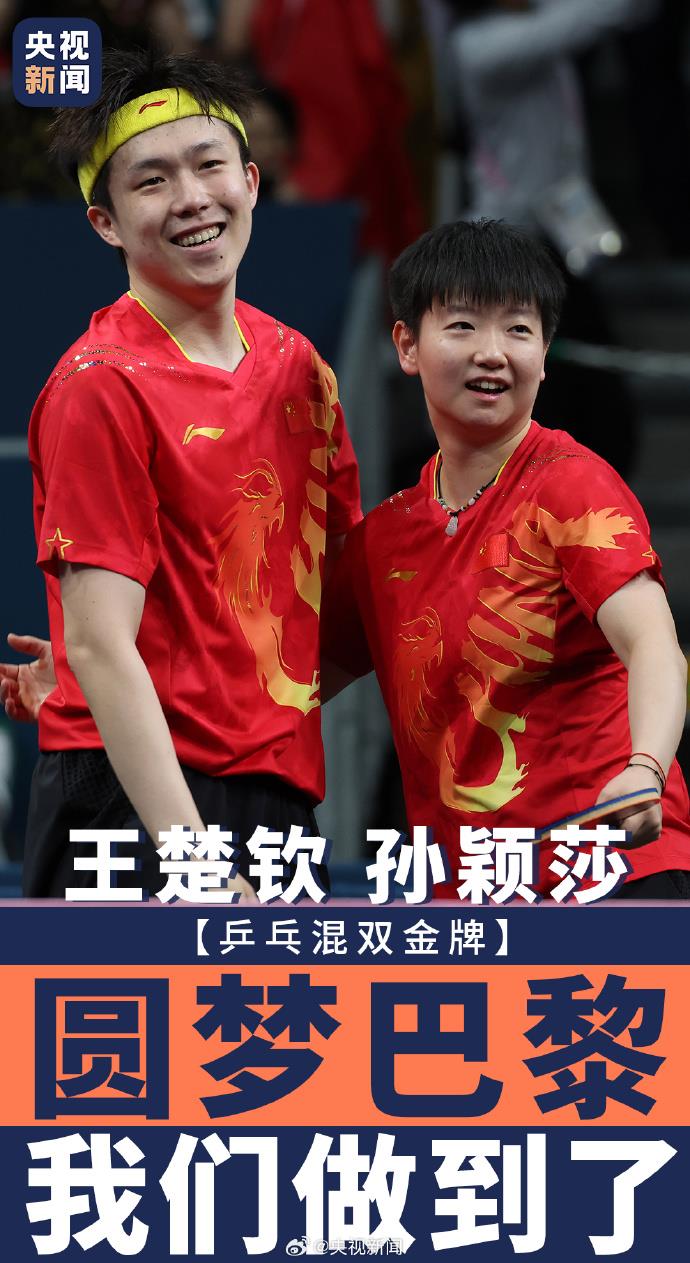 7月30日,在巴黎奧運會乒乓球混合雙打決賽中,中國組合王楚欽/孫穎莎4-2戰(zhàn)勝朝鮮組合,奪得金牌?!拔覀冏龅搅耍 睎|京的遺憾在巴黎畫上了一個圓滿的句號!