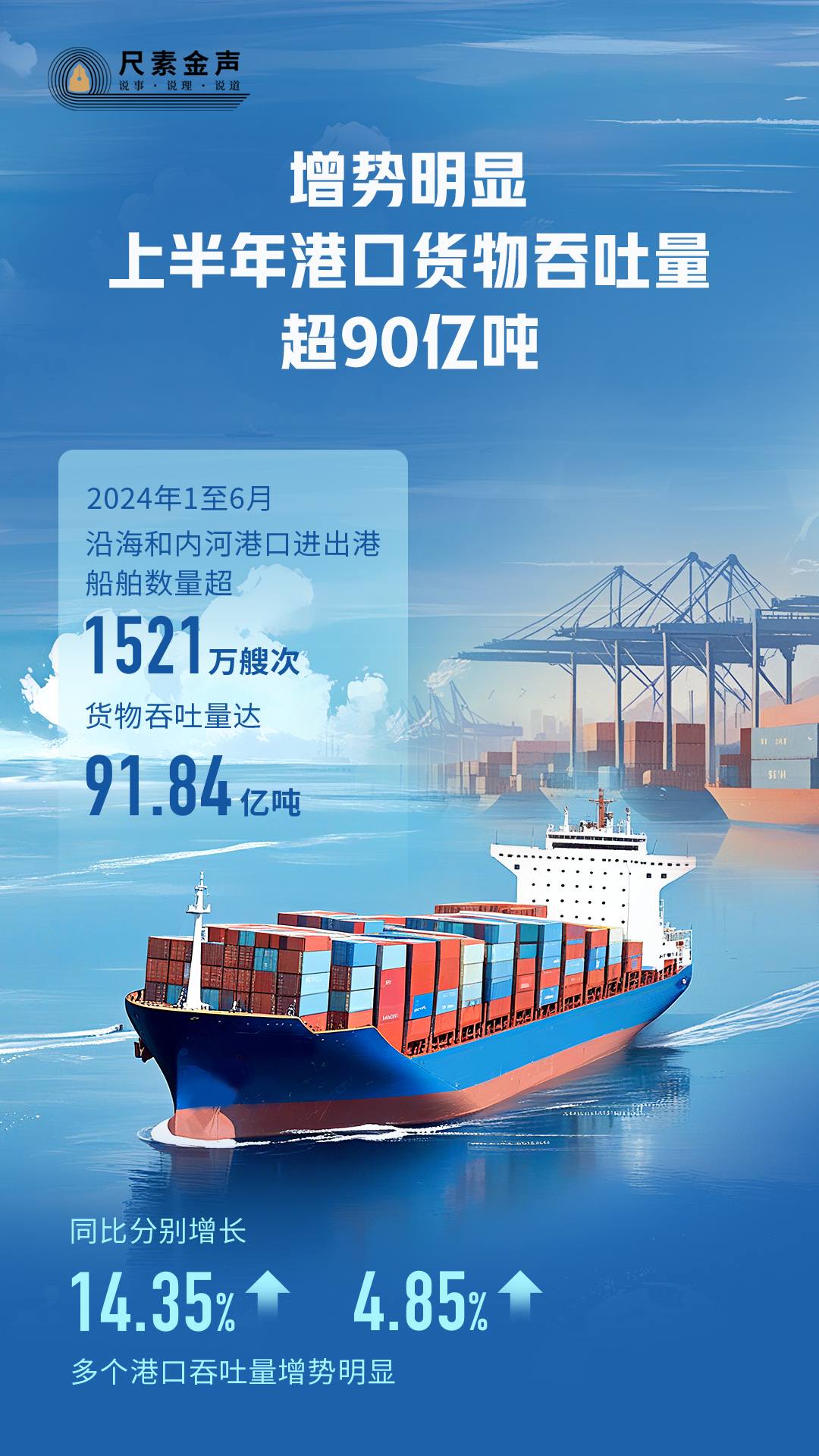 港口,貨物進出口的重要門戶;港口貨物吞吐量,國民經濟發(fā)展的“晴雨表”。日前,中國港口運行“半年報”公布:今年1至6月,沿海和內河港口進出港船舶數量超1521萬艘次,貨物吞吐量達91.84億噸,同比分別增長14.35%、4.85%,多個港口吞吐量增勢明顯。