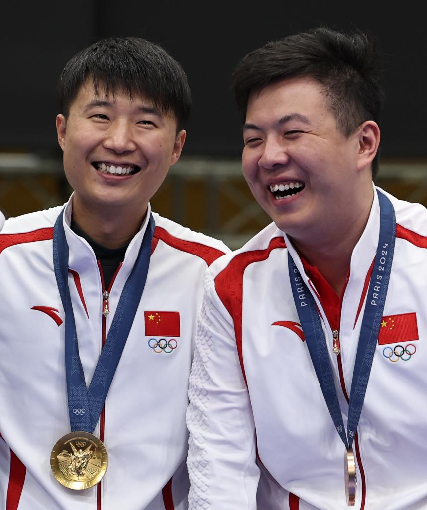 8月5日,冠軍中國(guó)選手李越宏(左)和季軍中國(guó)選手王鑫杰在頒獎(jiǎng)儀式上。新華社記者 張帆 攝